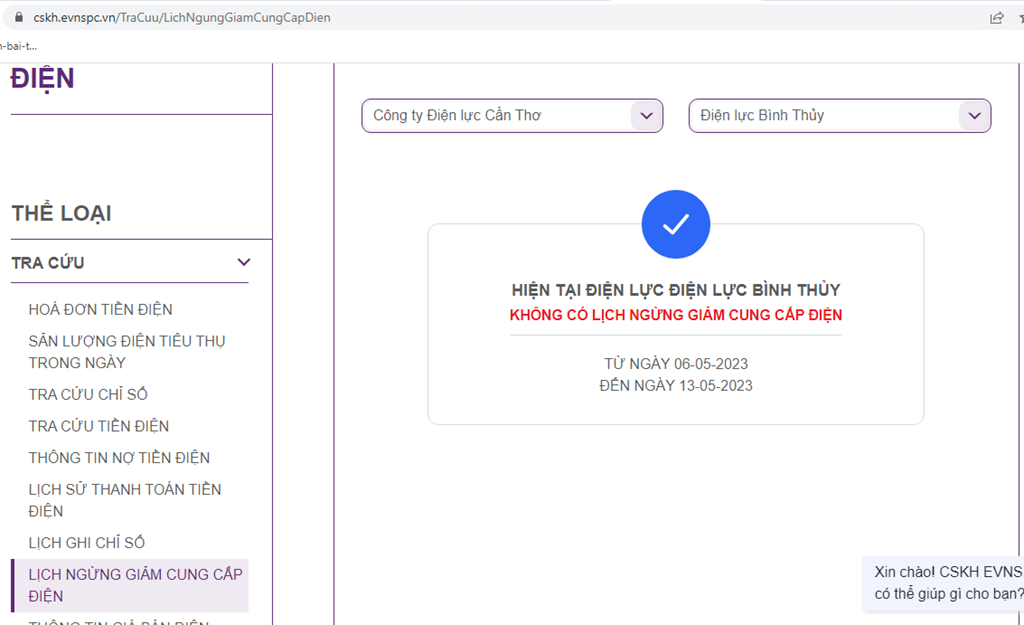 Lịch ngừng cấp điện tại Cần Thơ ngày mai 7/5 được cập nhật ngày 6/5 tại website của EVNSPC. Ảnh: BNEWS phát