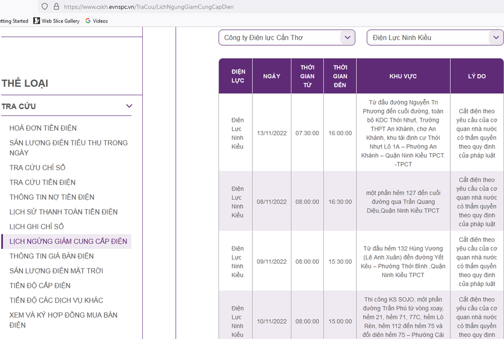 Để cập nhật lịch cắt điện Cần Thơ, người dân có thể truy cập: https://cskh.evnspc.vn/TraCuu/LichNgungGiamCungCapDien