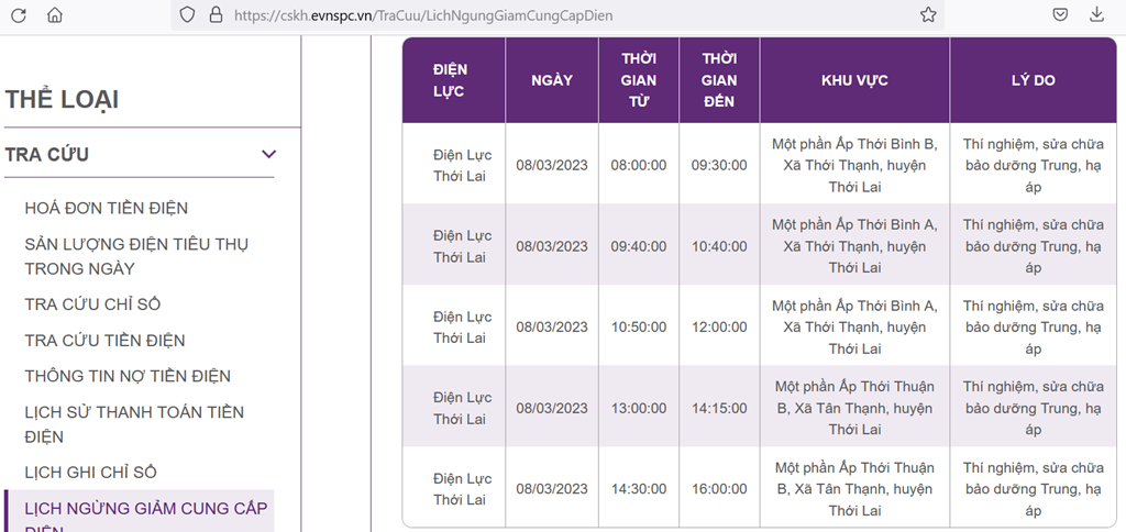 | Điện Lực Thốt Nốt | 08/03/2023 | 11:00:00 | 12:00:00 | Một phần KV Phúc Lộc 1, phường Trung Nhứt, quận Thốt Nốt, TP. Cần Thơ. | Thí nghiệm, sửa chữa bảo dưỡng Trung, hạ áp |