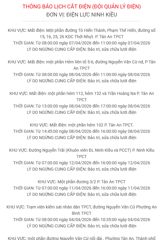 KHU VỰC: Mất điện: một phần Hẻm liên tổ 5-6, đường Nguyễn Văn Cừ nd, P Tân An TPCTTHỜI GIAN: Từ 08:00:00 ngày 08/04/2026 đến 11:00:00 ngày 08/04/2026LÝ DO NGỪNG CUNG CẤP ĐIỆN: Bảo trì, sửa chữa lưới điệnKHU VỰC: Mất điện: một phần hẻm 112, hẻm 132 và Trần Hoàng Na P. Tân An TPCTTHỜI GIAN: Từ 13:00:00 ngày 08/04/2026 đến 17:00:00 ngày 08/04/2026LÝ DO NGỪNG CUNG CẤP ĐIỆN: Bảo trì, sửa chữa lưới điệnKHU VỰC: Mất điện: một phần hẻm 102 P. Tân An TPCT.THỜI GIAN: Từ 14:45:00 ngày 08/04/2026 đến 16:00:00 ngày 08/04/2026LÝ DO NGỪNG CUNG CẤP ĐIỆN: Bảo trì, sửa chữa lưới điệnKHU VỰC: Một phần đường Lê Hồng Nhi - KV1 - P. Cái Răng - TP Cần ThơTHỜI GIAN: Từ 07:30:00 ngày 08/04/2026 đến 11:30:00 ngày 08/04/2026LÝ DO NGỪNG CUNG CẤP ĐIỆN: Thí nghiệm, sửa chữa bảo dưỡng Trung, hạ ápKHU VỰC: Một phần KV Phú Hưng, Thạnh Hưng, Phú Khánh - P. Hưng Phú - TP Cần ThơTHỜI GIAN: Từ 13:00:00 ngày 08/04/2026 đến 16:30:00 ngày 08/04/2026LÝ DO NGỪNG CUNG CẤP ĐIỆN: Thí nghiệm, sửa chữa bảo dưỡng Trung, hạ ápKHU VỰC: Mất điện một phần KV Thới Ngươn, Thới Ngươn B, Thới Hòa - P Phước Thới, Thành phố Cần ThơTHỜI GIAN: Từ 07:30:00 ngày 08/04/2026 đến 11:00:00 ngày 08/04/2026LÝ DO NGỪNG CUNG CẤP ĐIỆN: Thí nghiệm, sửa chữa bảo dưỡng Trung, hạ ápKHU VỰC: CS Đức Minh, phường Thốt Nốt, Tp. Cần Thơ.THỜI GIAN: Từ 08:00:00 ngày 08/04/2026 đến 09:00:00 ngày 08/04/2026LÝ DO NGỪNG CUNG CẤP ĐIỆN: Thí nghiệm, sửa chữa bảo dưỡng Trung, hạ ápKHU VỰC: CS Đức Minh, phường Thốt Nốt, Tp. Cần Thơ.THỜI GIAN: Từ 09:30:00 ngày 08/04/2026 đến 10:30:00 ngày 08/04/2026LÝ DO NGỪNG CUNG CẤP ĐIỆN: Thí nghiệm, sửa chữa bảo dưỡng Trung, hạ ápKHU VỰC: BHXH Thốt Nốt, phường Thốt Nốt, Tp. Cần Thơ.THỜI GIAN: Từ 12:00:00 ngày 08/04/2026 đến 13:00:00 ngày 08/04/2026LÝ DO NGỪNG CUNG CẤP ĐIỆN: Thí nghiệm, sửa chữa bảo dưỡng Trung, hạ ápKHU VỰC: Văn phòng Gentraco, phường Thốt Nốt, Tp. Cần Thơ.THỜI GIAN: Từ 13:30:00 ngày 08/04/2026 đến 14:30:00 ngày 08/04/2026LÝ DO NGỪNG CUNG CẤP ĐIỆN: Thí nghiệm, sửa chữa bảo dưỡng Trung, hạ ápKHU VỰC: Đoạn từ Rạch Ông Tường khu vực Bình Dương, - P Long Tuyền và khu vực Thới Thạnh, Thới Hòa - P Thới An ĐôngTHỜI GIAN: Từ 07:30:00 ngày 08/04/2026 đến 16:00:00 ngày 08/04/2026LÝ DO NGỪNG CUNG CẤP ĐIỆN: Bảo trì, sửa chữa lưới điệnKHU VỰC: Mất điện: một phần Hẻm liên tổ 5-6, đường Nguyễn Văn Cừ nd, P Tân An TPCTTHỜI GIAN: Từ 08:00:00 ngày 08/04/2026 đến 11:00:00 ngày 08/04/2026LÝ DO NGỪNG CUNG CẤP ĐIỆN: Bảo trì, sửa chữa lưới điệnKHU VỰC: Mất điện: một phần hẻm 112, hẻm 132 và Trần Hoàng Na P. Tân An TPCTTHỜI GIAN: Từ 13:00:00 ngày 08/04/2026 đến 17:00:00 ngày 08/04/2026LÝ DO NGỪNG CUNG CẤP ĐIỆN: Bảo trì, sửa chữa lưới điệnKHU VỰC: Mất điện: một phần hẻm 102 P. Tân An TPCT.THỜI GIAN: Từ 14:45:00 ngày 08/04/2026 đến 16:00:00 ngày 08/04/2026LÝ DO NGỪNG CUNG CẤP ĐIỆN: Bảo trì, sửa chữa lưới điệnKHU VỰC: Ấp Định Hòa B, Xã Trường ThànhTHỜI GIAN: Từ 07:30:00 ngày 08/04/2026 đến 09:30:00 ngày 08/04/2026LÝ DO NGỪNG CUNG CẤP ĐIỆN: Thí nghiệm, sửa chữa bảo dưỡng Trung, hạ ápKHU VỰC: Ấp Định Hòa A, Xã Trường ThànhTHỜI GIAN: Từ 10:00:00 ngày 08/04/2026 đến 11:00:00 ngày 08/04/2026LÝ DO NGỪNG CUNG CẤP ĐIỆN: Thí nghiệm, sửa chữa bảo dưỡng Trung, hạ ápKHU VỰC: Thuộc đường Tôn Đức Thắng (từ giáp 87,108 đến giáp nhà số 115, 226).THỜI GIAN: Từ 07:30:00 ngày 08/04/2026 đến 12:00:00 ngày 08/04/2026LÝ DO NGỪNG CUNG CẤP ĐIỆN: Thí nghiệm, sửa chữa bảo dưỡng Trung, hạ ápKHU VỰC: Thuộc đường Cao Thắng (từ giáp đường Phạm Hùng đến giáp Cầu Maspero)THỜI GIAN: Từ 13:00:00 ngày 08/04/2026 đến 17:00:00 ngày 08/04/2026LÝ DO NGỪNG CUNG CẤP ĐIỆN: Thí nghiệm, sửa chữa bảo dưỡng Trung, hạ ápKHU VỰC: Bao gồm một phần các ấp; Ấp Kinh Ngay 2 - xã Vĩnh Lợi; ấp Kinh Ngay 1 – xã Phú Lộc.THỜI GIAN: Từ 08:00:00 ngày 08/04/2026 đến 12:30:00 ngày 08/04/2026LÝ DO NGỪNG CUNG CẤP ĐIỆN: Thí nghiệm, sửa chữa bảo dưỡng Trung, hạ ápKHU VỰC: Một phần ấp Kinh Ngay 1 – xã Phú Lộc.THỜI GIAN: Từ 12:00:00 ngày 08/04/2026 đến 16:30:00 ngày 08/04/2026LÝ DO NGỪNG CUNG CẤP ĐIỆN: Thí nghiệm, sửa chữa bảo dưỡng Trung, hạ ápKHU VỰC: Khu vực 16, Phường Vị Tân, TP Cần ThơTHỜI GIAN: Từ 08:00:00 ngày 08/04/2026 đến 09:00:00 ngày 08/04/2026LÝ DO NGỪNG CUNG CẤP ĐIỆN: Thí nghiệm, sửa chữa bảo dưỡng Trung, hạ ápKHU VỰC: Ấp Thạnh Trung, Xã Hỏa Lựu, TP Cần ThơTHỜI GIAN: Từ 10:00:00 ngày 08/04/2026 đến 11:00:00 ngày 08/04/2026LÝ DO NGỪNG CUNG CẤP ĐIỆN: Thí nghiệm, sửa chữa bảo dưỡng Trung, hạ ápKHU VỰC: Ấp Trầu Hôi và ấp Trầu Hôi A, xã Thạnh Xuân, TP. Cần ThơTHỜI GIAN: Từ 07:00:00 ngày 08/04/2026 đến 11:00:00 ngày 08/04/2026LÝ DO NGỪNG CUNG CẤP ĐIỆN: Thí nghiệm, sửa chữa bảo dưỡng Trung, hạ ápEVNSPC khuyến cáo người dân sử dụng các thiết bị điện đúng cách, tiết kiệm, hiệu quả để giảm tiêu thụ điện, góp phần giảm chi phí tiền điện sử dụng trong sinh hoạt cuộc sống thường ngày.Để hạn chế ảnh