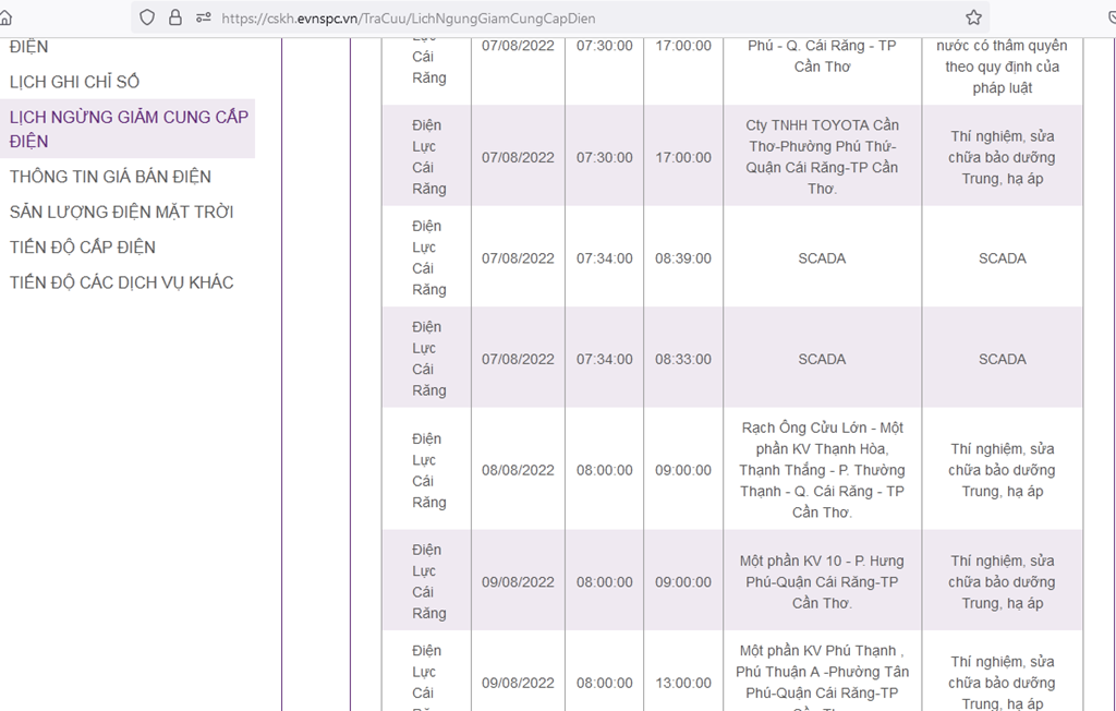 | Điện Lực Cái Răng | 08/08/2022 | 13:00:00 | 16:30:00 | Một phần KV3 - P. Ba Láng - Q. Cái Răng - TP Cần Thơ. | Thí nghiệm, sửa chữa bảo dưỡng Trung, hạ áp |