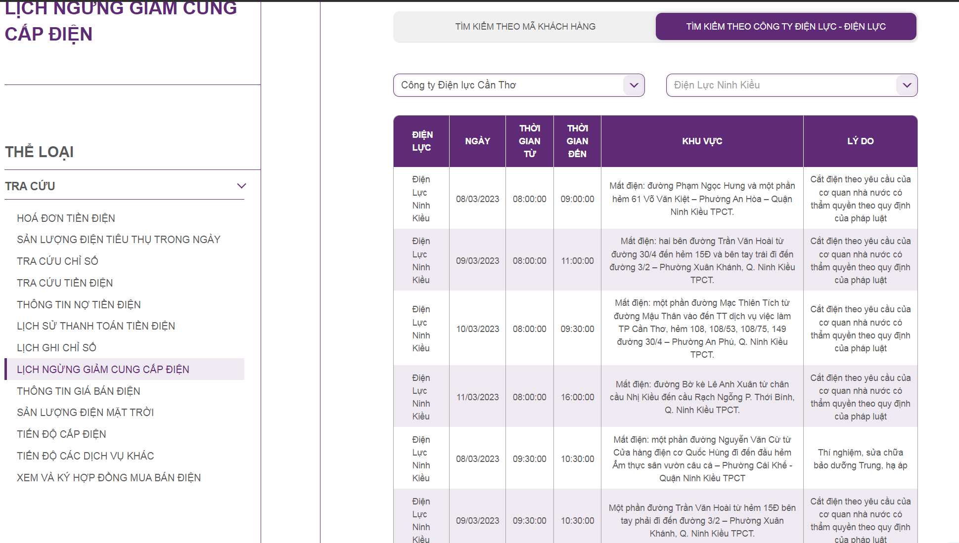 | Điện Lực Ninh Kiều | 09/03/2023 | 8:00:00 | 11:00:00 | Mất điện: hai bên đường Trần Văn Hoài từ đường 30/4 đến hẻm 15Đ và bên tay trái đi đến đường 3/2 – Phường Xuân Khánh, Q. Ninh Kiều TPCT. | Cắt điện theo yêu cầu của cơ quan nhà nước có thẩm quyền theo quy định của pháp luật |