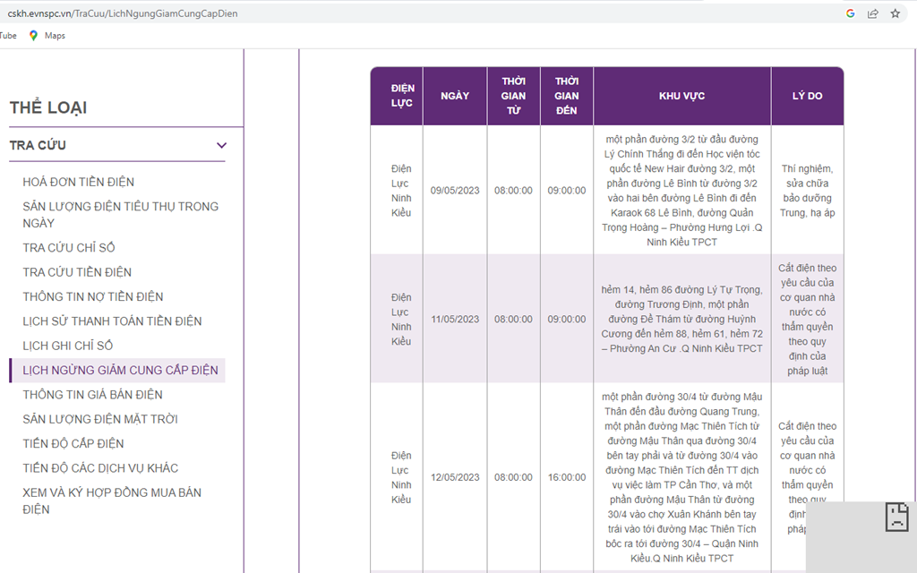 Lịch ngừng cấp điện tại Cần Thơ ngày mai 9/5 được cập nhật ngày 8/5 tại website của EVNSPC. Ảnh: BNEWS phát