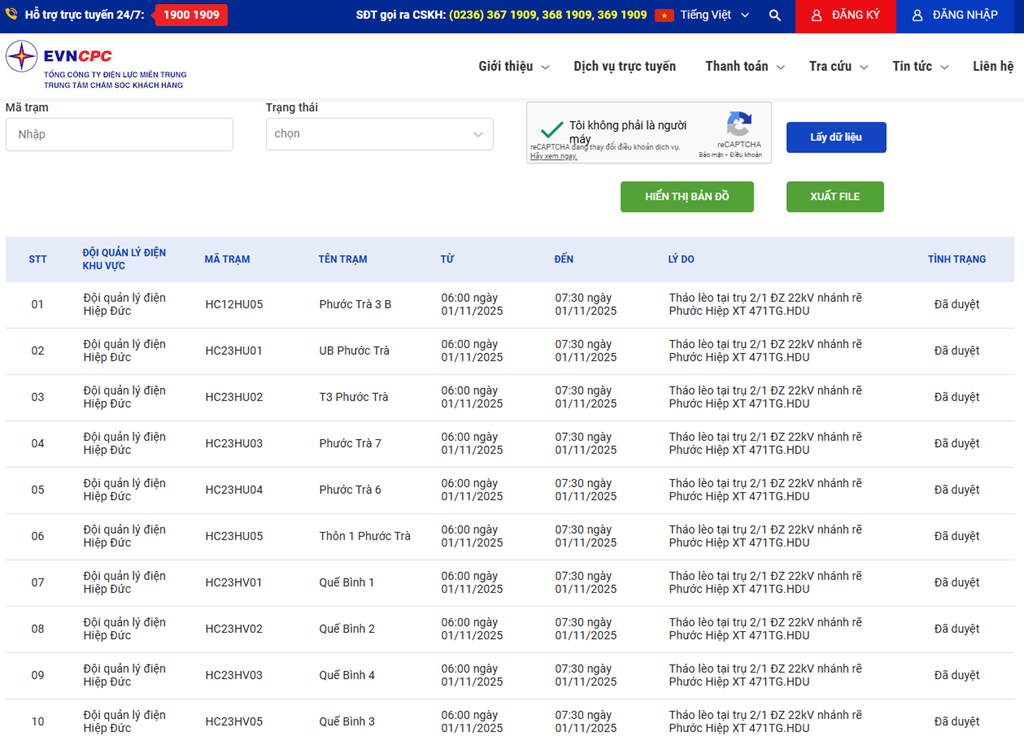 | 1 | Đội quản lý điện Hiệp Đức | HC12HU05 | Phước Trà 3 B | 06:00 01/11/2025 | 07:30 01/11/2025 | Tháo lèo tại trụ 2/1 ĐZ 22kV nhánh rẽ Phước Hiệp XT 471TG.HDU | Đã duyệt |