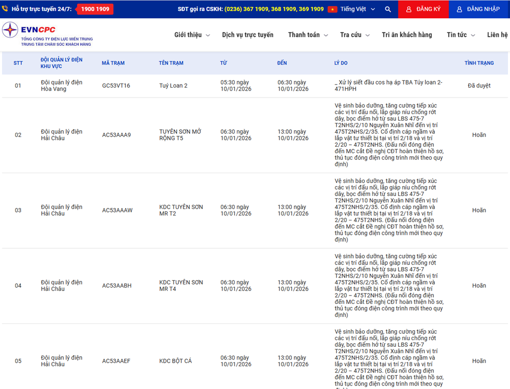 Lịch cắt điện trên địa bàn Thành phố Đà Nẵng ngày mai 10/1/2026 cập nhật mới nhất từ website Tổng công ty Điện lực miền Trung.