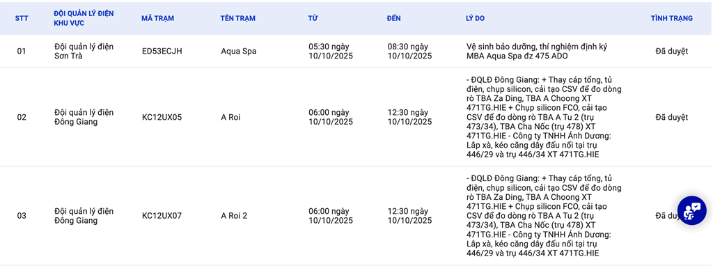 1 | Đội quản lý điện Sơn Trà | ED53ECJH | Aqua Spa | 05:30 10/10/2025 | 08:30 10/10/2025 | Vệ sinh bảo dưỡng, thí nghiệm định ký MBA Aqua Spa đz 475 ADO | Đã duyệt |