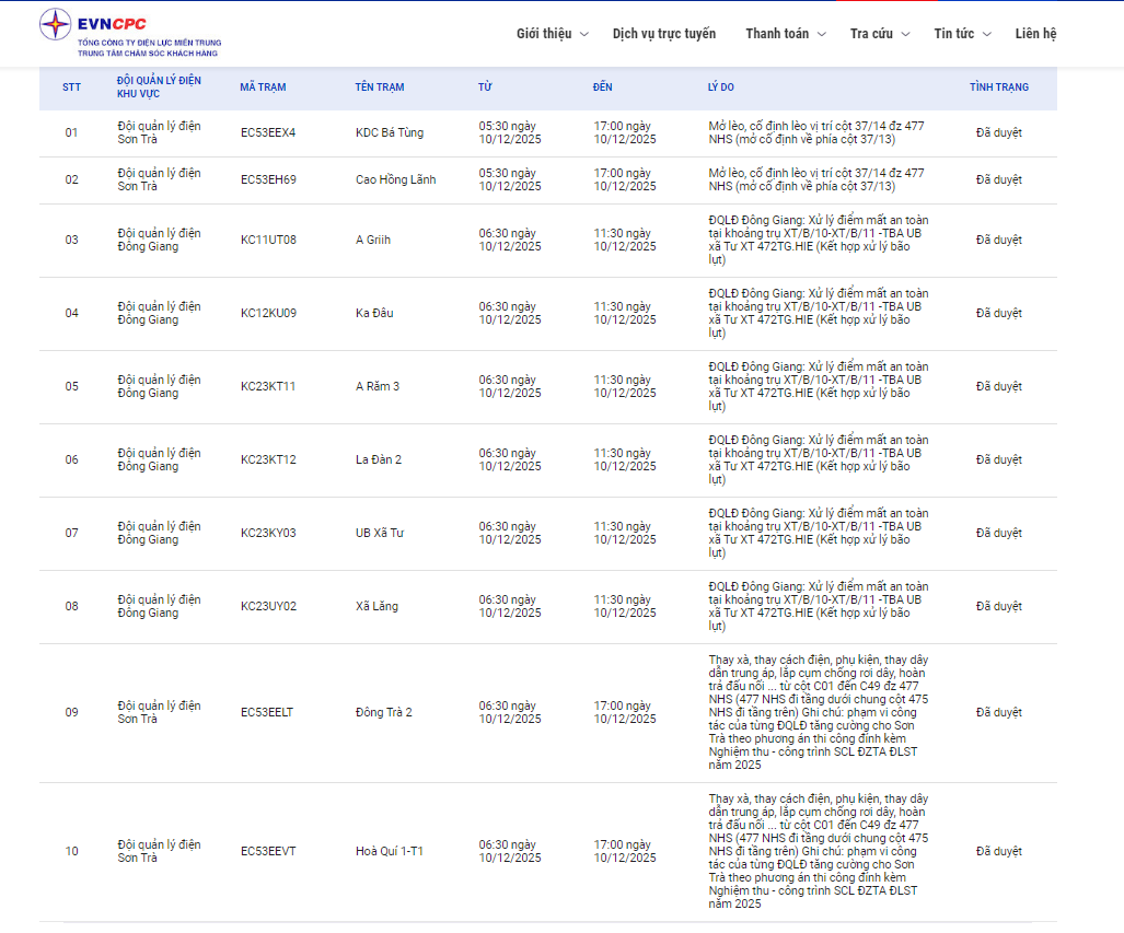 | Đội quản lý điện Hòa Vang | GC53HHYM | Nam Yên | 07:00 10/12/2025 | 17:00 10/12/2025 | _ Thay dây hạ áp không đảm bảo vận hành từ VT A3 đến B6, từ A3 đến A3/4, từ A3 đến A11 thuộc TBA Nam Yên-476HLI | Đã duyệt |