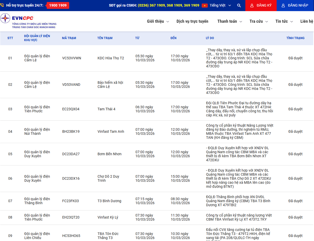 | 4 | Đội quản lý điện Núi Thành | BH23BK19 | Vinfast Tam Anh | 07:00 10/03/2026 | 12:00 10/03/2026 | Công ty cổ phần kỷ thuật Năng Lượng Việt đăng ký Bảo dưỡng, thí nghiệm tủ RMU, MBA thuộc TBA Vinfast Tam Anh XT 477 TAN (KH đăng ký CBM) | Đã duyệt |
