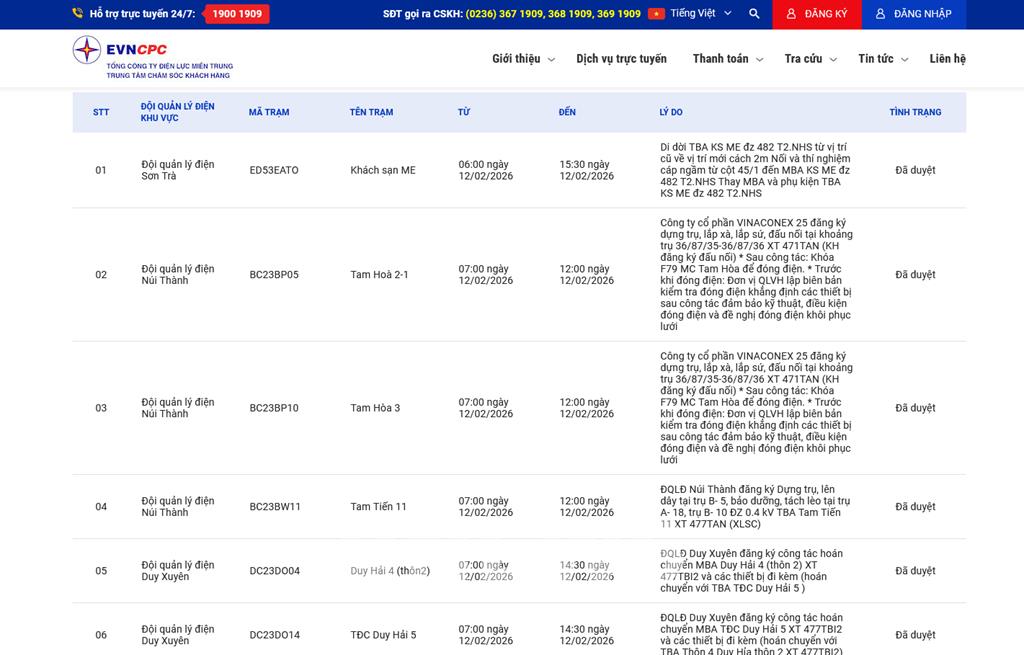 | 5 | Đội quản lý điện Duy Xuyên | DC23DO04 | Duy Hải 4 (thôn2) | 07:00 12/02/2026 | 14:30 12/02/2026 | ĐQLĐ Duy Xuyên đăng ký công tác hoán chuyển MBA Duy Hải 4 (thôn 2) XT 477TBI2 và các thiết bị đi kèm (hoán chuyển với TBA TĐC Duy Hải 5 ) | Đã duyệt |