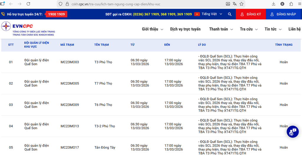 Lịch cắt điện Đà Nẵng ngày 13/3 cập nhật tại website của EVNCPC. Ảnh: BNEWS/TTXVN