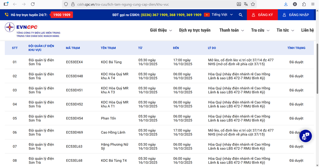 Đội quản lý điện Sơn Trà | EC53EH48 | KDC Hòa Quý MR khu A T4 | 05:30 16/10/2025 | 06:00 16/10/2025 | Hòa Quý (nháy điện nhánh rẽ Cao Hồng Lãnh & sao LBS 472-7 RMU Bình Kỳ) | Đã duyệt |