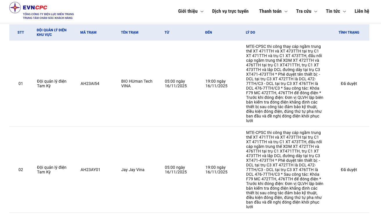 | Đội quản lý điện Tam Kỳ | AH23AY01 | Jay Jay Vina | 05:00 16/11/2025 | 19:00 16/11/2025 | MTE-CPSC thi công thay cáp ngầm trung thế XT 471TTH và XT 473TTH tại trụ C1 XT 471TTH và trụ C1 XT 473TTH, đấu nối cáp ngầm trung thế XDM XT 472TTH và 476TTH tại trụ C1 XT471TTH, trụ C1 XT 473TTH và lắp DCL đường dây tại trụ C3 XT471-473TTH* Phê duyệt tên thiết bị:- DCL tại trụ C3 XT 472TTH là DCL 472-7TTH/C3- DCL tại trụ C3 XT 476TTH là DCL 476-7TTH/C3* Sau công tác: Khóa F79 MC 472TTH, 476TTH để đóng điện* Trước khi đóng điện: Đơn vị QLVH lập biên bản kiểm tra đóng điện khẳng định các thiết bị sau công tác đảm bảo kỹ thuật, điều kiện đóng điện, đúng thứ tự pha như ban đầu và đề nghị đóng điện khôi phục lưới | Đã duyệt |