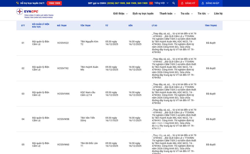 | 6 | Đội quản lý điện Cẩm Lệ | VD53VALO | Công ty AMIGOS | 05:30 16/12/2025 | 16:30 16/12/2025 | _Thay dây, xà, sứ,... từ vị trí 64 đến vị trí 79 - 479HXU ._Đội QLĐ Cẩm Lệ + TTDVĐN: Thí nghiệm CBM TIER 2 và kiểm định thiết bị TBA Huỳnh Xuân Nhị, KDC NCCL T4 - 479HXU.Công trình: Thí nghiệm định kỳ năm 2026Công trình SCL: Sửa chữa đường dây trung áp từ VT 64 đến VT 79 - 479HXU | Đã duyệt |