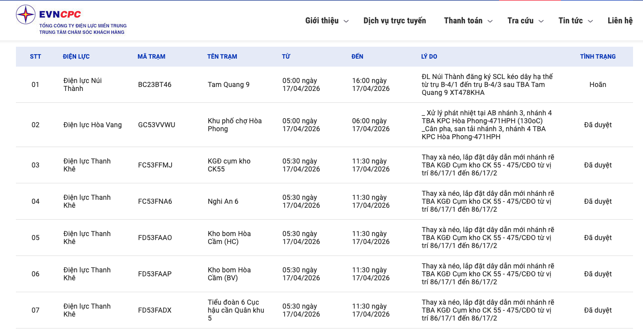 | Điện lực Thanh Khê | FC53FNA6 | Nghi An 6 | 05:30 17/04/2026 | 11:30 17/04/2026 | Thay xà néo, lắp đặt dây dẫn mới nhánh rẽ TBA KGĐ Cụm kho CK 55 - 475/CĐO từ vị trí 86/17/1 đến 86/17/2 | Đã duyệt |