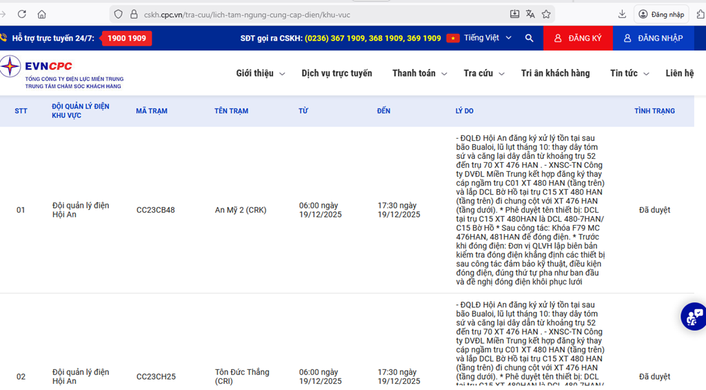 | Đội quản lý điện Hội An | CC23CH25 | Tôn Đức Thắng (CRI) | 06:00 19/12/2025 | 17:30 19/12/2025 | - ĐQLĐ Hội An đăng ký xử lý tồn tại sau bão Bualoi, lũ lụt tháng 10: thay dây tóm sứ và căng lại dây dẫn từ khoảng trụ 52 đến trụ 70 XT 476 HAN .- XNSC-TN Công ty DVĐL Miền Trung kết hợp đăng ký thay cáp ngầm trụ C01 XT 480 HAN (tầng trên) và lắp DCL Bờ Hồ tại trụ C15 XT 480 HAN (tầng trên) đi chung cột với XT 476 HAN (tầng dưới). * Phê duyệt tên thiết bị: DCL tại trụ C15 XT 480HAN là DCL 480-7HAN/C15 Bờ Hồ* Sau công tác: Khóa F79 MC 476HAN, 481HAN để đóng điện.* Trước khi đóng điện: Đơn vị QLVH lập biên bản kiểm tra đóng điện khẳng định các thiết bị sau công tác đảm bảo kỹ thuật, điều kiện đóng điện, đúng thứ tự pha như ban đầu và đề nghị đóng điện khôi phục lưới | Đã duyệt |