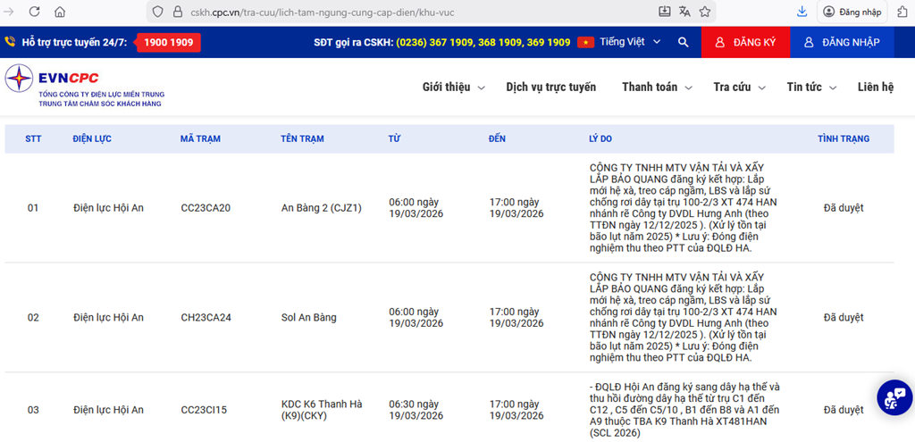 | Điện lực Hội An | CC23CA20 | An Bàng 2 (CJZ1) | 06:00 19/03/2026 | 17:00 19/03/2026 | CÔNG TY TNHH MTV VẬN TẢI VÀ XẤY LẮP BẢO QUANG đăng ký kết hợp: Lắp mới hệ xà, treo cáp ngầm, LBS và lắp sứ chống rơi dây tại trụ 100-2/3 XT 474 HAN nhánh rẽ Công ty DVDL Hưng Anh (theo TTĐN ngày 12/12/2025 ). (Xử lý tồn tại bão lụt năm 2025)* Lưu ý: Đóng điện nghiệm thu theo PTT của ĐQLĐ HA. | Đã duyệt |