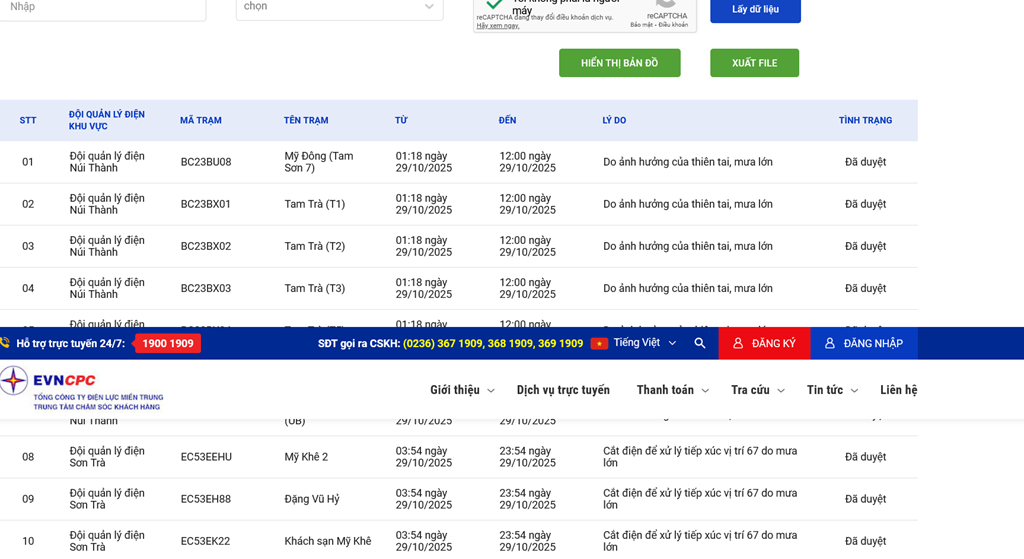 | 3 | Đội quản lý điện Núi Thành | BC23BX02 | Tam Trà (T2) | 01:18 29/10/2025 | 12:00 29/10/2025 | Do ảnh hưởng của thiên tai, mưa lớn | Đã duyệt |