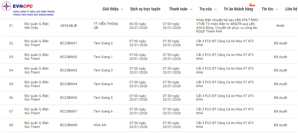 | Đội quản lý điện Núi Thành | BC23BM02 | Tam Giang 1 | 07:00 20/01/2026 | 07:30 20/01/2026 | Cắt 3 FCO ĐT Cảng Cá An Hòa XT 473 KHA | Đã duyệt |