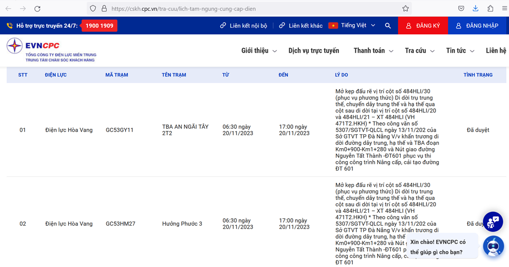 | 3 | Điện lực Hải Châu | AC53AACN | NGUYỄN CHÍ THANH 1 | 07:30 20/11/2023 | 10:30 20/11/2023 | Xử lý cách điện cáp hạ áp, cố định cáp vặn xoắn vào trụ TBA và đấu nối cấp điện cho Khách hàng vào tủ điện trạm TBA Nguyễn Chí Thanh 1 - 475CLA. | Đã duyệt |