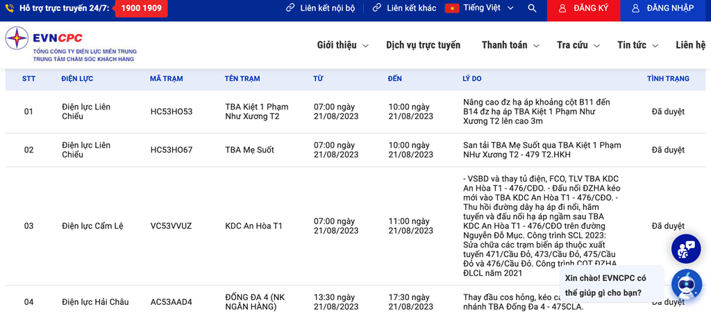 | 7 | Điện lực Liên Chiểu | HC53HHRO | Cầu Liên Chiểu | 14:00 21/08/2023 | 16:30 21/08/2023 | San tải TBA Cầu Liên Chiểu qua Cầu Liên Chiểu T2 - 479 LCH | Đã duyệt |