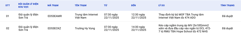 | 1 | Đội quản lý điện Sơn Trà | ED53EAMR | Trung tâm Internet Việt Nam | 07:30 22/11/2025 | 12:30 22/11/2025 | Thay định kỳ bộ MOF TBA Trung tâm Internet Việt Nam đz 474 ADO | Đã duyệt |