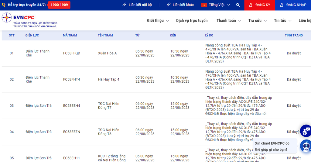 | 1 | Điện lực Thanh Khê | FC53FFQD | Xuân Hòa A | 05:30 22/08/2023 | 10:30 22/08/2023 | Nâng công suất TBA Hà Huy Tập 4 - 476/XHA lên 400kVA, san tải TBA Xuân Hòa A - 476/XHA sang TBA Hà Huy Tập 4 - 476/XHA (Công trình CQT ĐZTA và TBA ĐLTK 2023) | Đã duyệt |