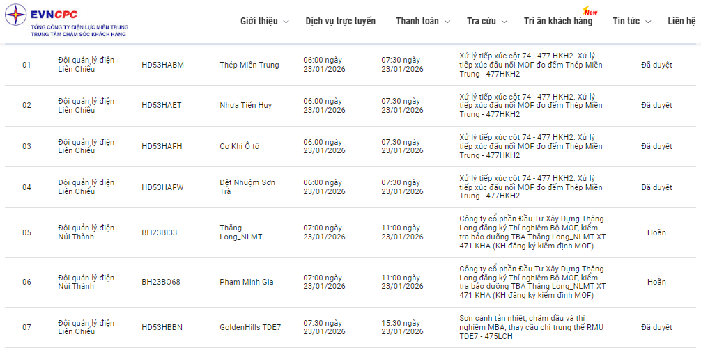 | Đội quản lý điện Liên Chiểu | HD53HBBP | GoldenHills TDE9 | 07:30 23/01/2026 | 15:30 23/01/2026 | Sơn cánh tản nhiệt, châm dầu và thí nghiệm MBA, thay cầu chì trung thế RMU TDE7 - 475LCH | Đã duyệt |