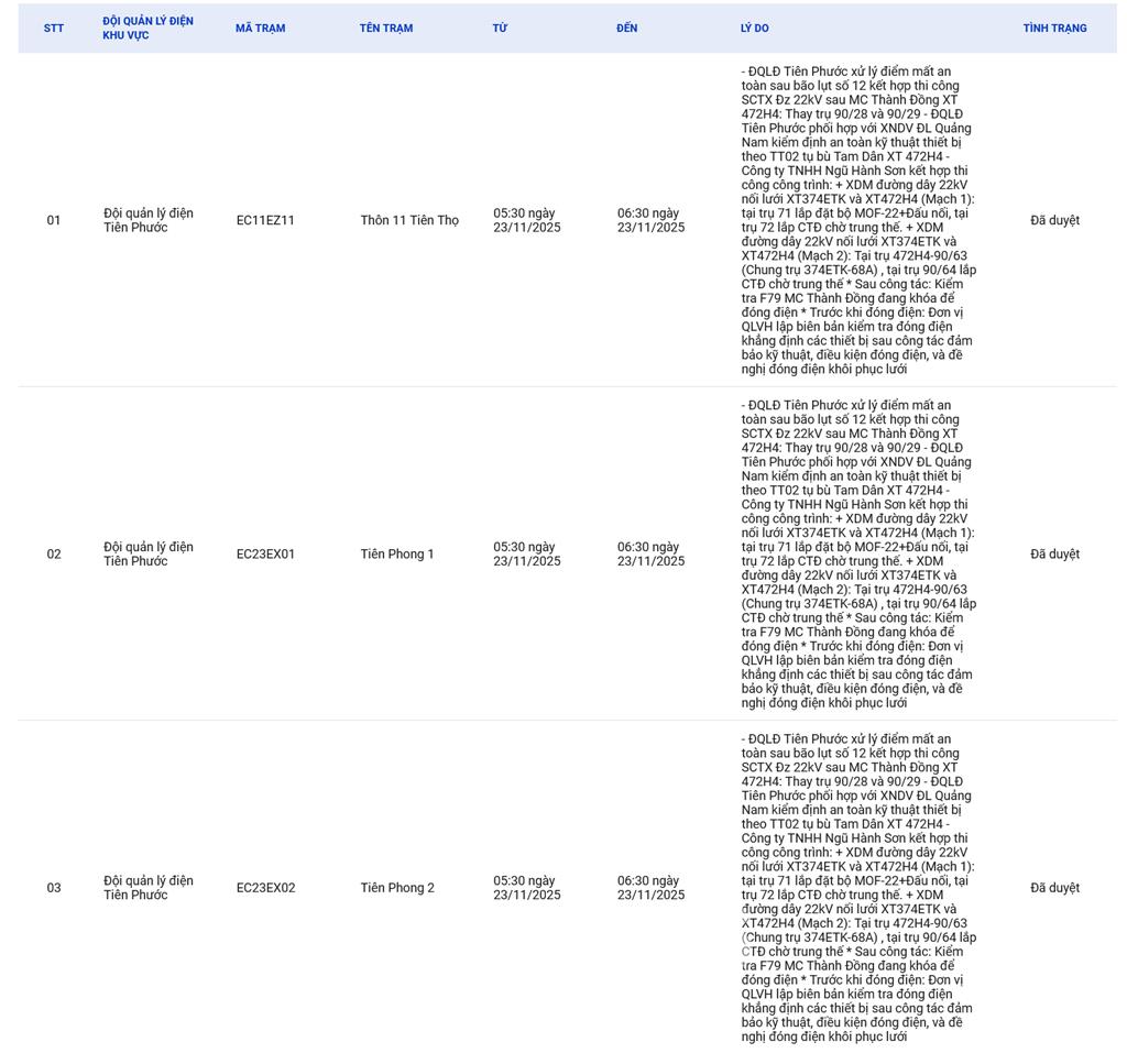 | 4 | Đội quản lý điện Tiên Phước | EC23EX03 | Thôn 1 Tiên Phong | 05:30 23/11/2025 | 06:30 23/11/2025 | - ĐQLĐ Tiên Phước xử lý điểm mất an toàn sau bão lụt số 12 kết hợp thi công SCTX Đz 22kV sau MC Thành Đồng XT 472H4: Thay trụ 90/28 và 90/29- ĐQLĐ Tiên Phước phối hợp với XNDV ĐL Quảng Nam kiểm định an toàn kỹ thuật thiết bị theo TT02 tụ bù Tam Dân XT 472H4- Công ty TNHH Ngũ Hành Sơn kết hợp thi công công trình: + XDM đường dây 22kV nối lưới XT374ETK và XT472H4 (Mạch 1): tại trụ 71 lắp đặt bộ MOF-22+Đấu nối, tại trụ 72 lắp CTĐ chờ trung thế.+ XDM đường dây 22kV nối lưới XT374ETK và XT472H4 (Mạch 2): Tại trụ 472H4-90/63 (Chung trụ 374ETK-68A) , tại trụ 90/64 lắp CTĐ chờ trung thế* Sau công tác: Kiểm tra F79 MC Thành Đồng đang khóa để đóng điện* Trước khi đóng điện: Đơn vị QLVH lập biên bản kiểm tra đóng điện khẳng định các thiết bị sau công tác đảm bảo kỹ thuật, điều kiện đóng điện, và đề nghị đóng điện khôi phục lưới | Đã duyệt |