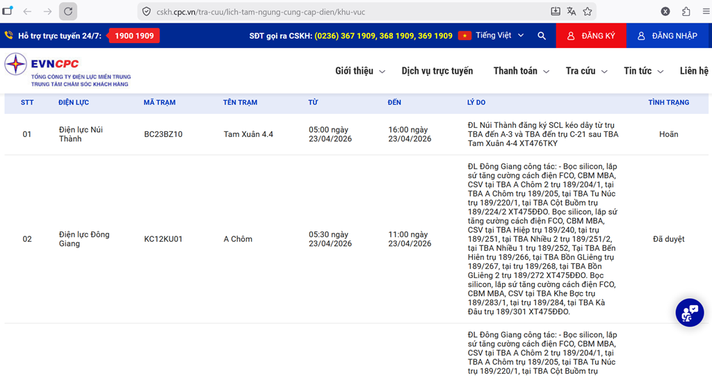 | Điện lực Điện Bàn | IC23IF94 | Câu Hà | 07:00 23/04/2026 | 11:00 23/04/2026 | ĐL Điện Bàn thay hoán chuyển MBA + AB tổng TBA Câu Hà XT487ĐNĐN | Đã duyệt |