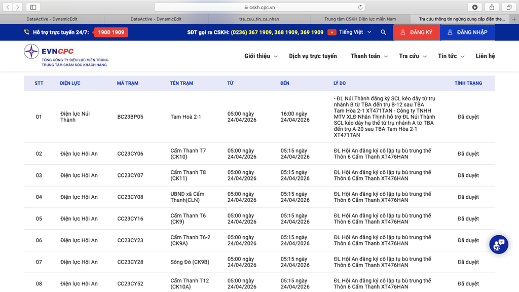 | 10 | Điện lực Hội An | CD23CY12 | Hà An - Vitours | 05:00 24/04/2026 | 05:15 24/04/2026 | ĐL Hội An đăng ký cô lập tụ bù trung thế Thôn 6 Cẩm Thanh XT476HAN | Đã duyệt |