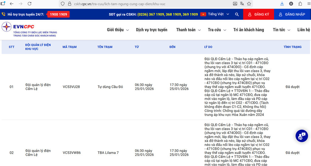 | Đội quản lý điện Cẩm Lệ | VC53VW86 | TBA Lilama 7 | 06:30 25/01/2026 | 17:30 25/01/2026 | Đội QLĐ Cẩm Lệ:- Tháo hạ cáp ngầm cũ, thu lôi van class 3 tại vị trí C01 - 471CĐO (chung trụ với 474CĐO)- Cố định cáp ngầm mới, lắp đặt thu lôi van class 3, thay xà đỡ thành xà néo, lắp sứ chuỗi, khóa néo và đấu nối lèo cáp ngầm tại vị trí C02 - 471CĐO (chung trụ 474CĐO) phục vụ thay thế cáp ngầm xuất tuyến 471CĐO.Đội QLĐ Cẩm Lệ + TTDVĐN 1:- Tháo đầu cáp cũ tại ngăn lộ MC 471CĐO, đưa cáp mới vào ngăn lộ, làm đầu cáp và PD cáp từ ngăn lộ đến vị trí C02 - 471CĐO. (Tách không điện đoạn C1-C2, Không thu hồi)Công trình: Chống quá tải đường dây trung áp khu vực Hòa Xuân năm 2024 | Đã duyệt |