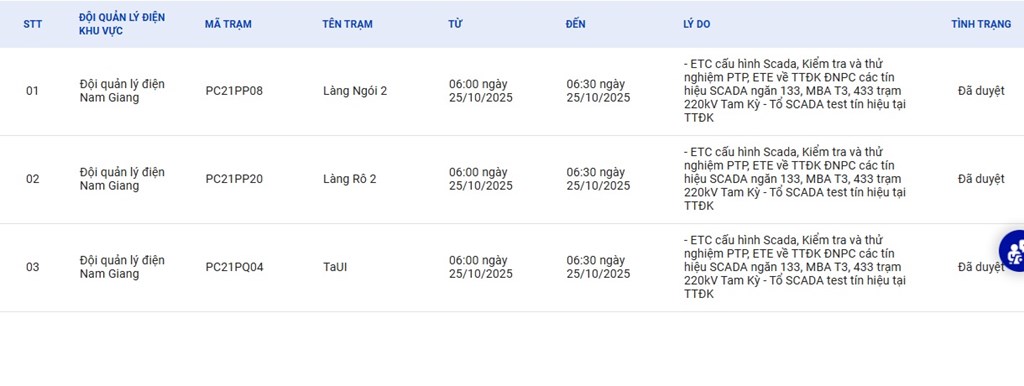 | 10 | Đội quản lý điện Nam Giang | PC21PQ11 | Lơ bơ 2 | 06:00 25/10/2025 | 06:30 25/10/2025 | - ETC cấu hình Scada, Kiểm tra và thử nghiệm PTP, ETE về TTĐK ĐNPC các tín hiệu SCADA ngăn 133, MBA T3, 433 trạm 220kV Tam Kỳ- Tổ SCADA test tín hiệu tại TTĐK | Đã duyệt |