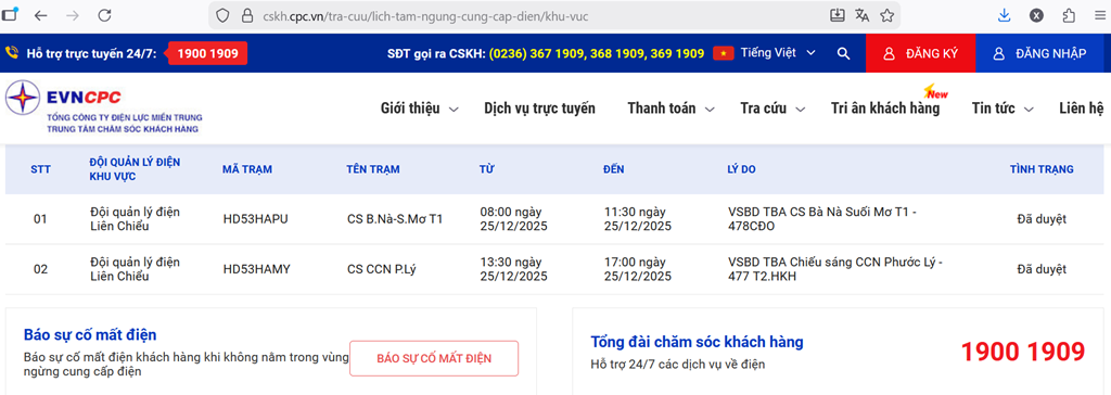 Tổng công ty Điện lực miền Trung (EVNCPC) thông báo lịch tạm ngừng cung cấp điện (lịch cúp điện Đà Nẵng) ngày mai 25/12 cập nhật mới nhất như sau:
