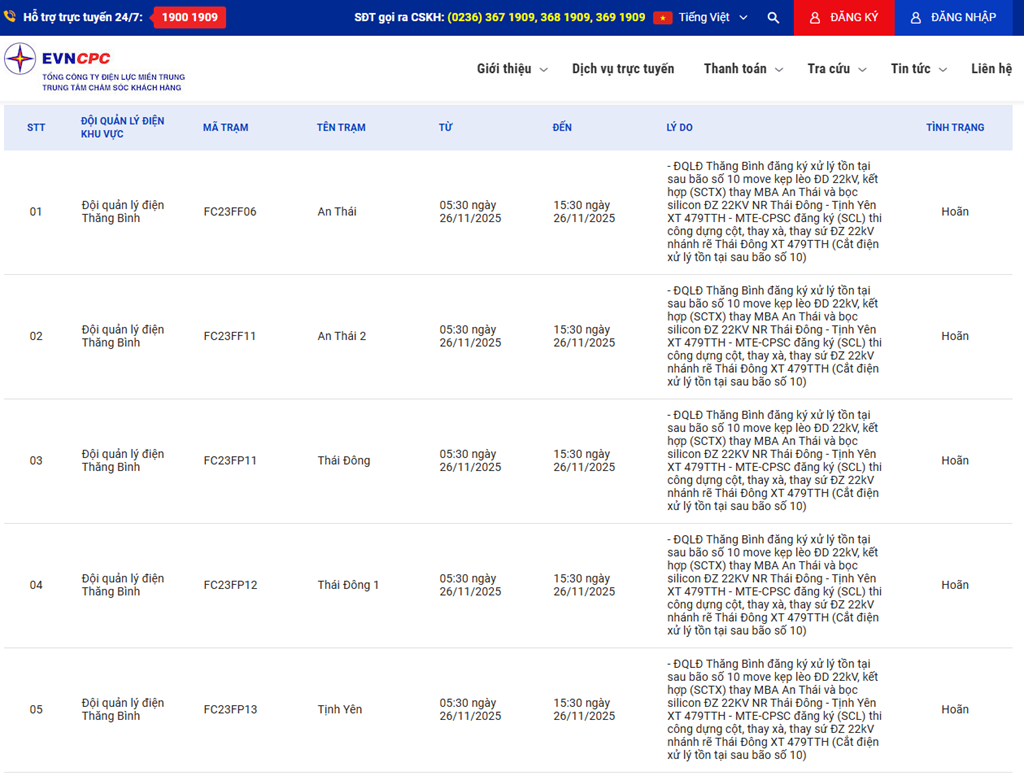 | 6 | Đội quản lý điện Thăng Bình | FC23FP17 | Thái Đông 2 | 05:30 26/11/2025 | 15:30 26/11/2025 | - ĐQLĐ Thăng Bình đăng ký xử lý tồn tại sau bão số 10 move kẹp lèo ĐD 22kV, kết hợp (SCTX) thay MBA An Thái và bọc silicon ĐZ 22KV NR Thái Đông - Tịnh Yên XT 479TTH- MTE-CPSC đăng ký (SCL) thi công dựng cột, thay xà, thay sứ ĐZ 22kV nhánh rẽ Thái Đông XT 479TTH(Cắt điện xử lý tồn tại sau bão số 10) | Hoãn |
