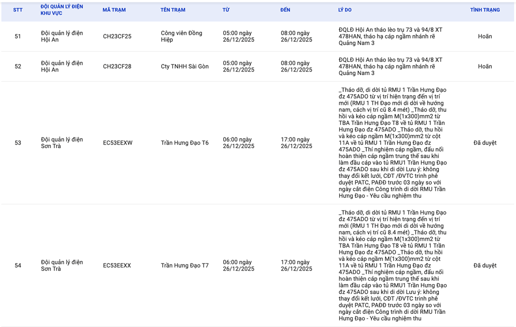 | 1 | Đội quản lý điện Hội An | CH23CF25 | Công viên Đồng Hiệp | 05:00 26/12/2025 | 08:00 26/12/2025 | ĐQLĐ Hội An tháo lèo trụ 73 và 94/8 XT 478HAN, tháo hạ cáp ngầm nhánh rẽ Quảng Nam 3 | Hoãn |