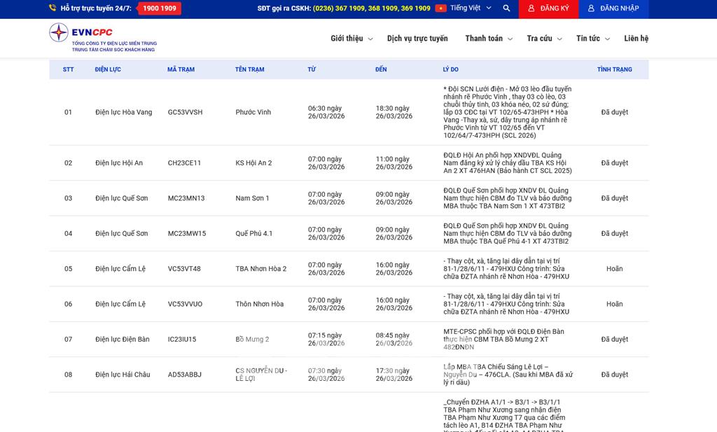 | 2 | Điện lực Hội An | CH23CE11 | KS Hội An 2 | 07:00 26/03/2026 | 11:00 26/03/2026 | ĐQLĐ Hội An phối hợp XNDVĐL Quảng Nam đăng ký xử lý chảy dầu TBA KS Hội An 2 XT 476HAN (Bảo hành CT SCL 2025) | Đã duyệt |