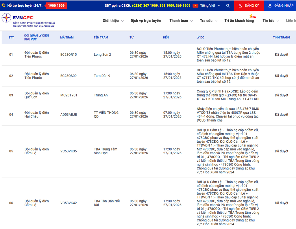 | 4 | Đội quản lý điện Hải Châu | AD53ABJB | TT VIỄN THÔNG QĐ | 06:30 27/01/2026 | 07:00 27/01/2026 | Nháy điện chuyển tải sau LBS 476-7 RMU VTQĐ T3 nhận điện từ 480LTR qua LBS 434-4 đóng. Chuyển tải phục vụ công tác ĐQLĐ Thanh Khê | Đã duyệt |