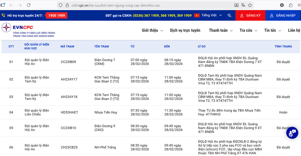 | Đội quản lý điện Hội An | CH23CG03 | BV Hội An | 13:00 28/02/2026 | 17:00 28/02/2026 | ĐQLĐ Hội An phối hợp XNDV ĐL Quảng Nam đăng ký Xử lý rỉ dầu TBA BV Hội An XT 471 HAN | Đã duyệt |