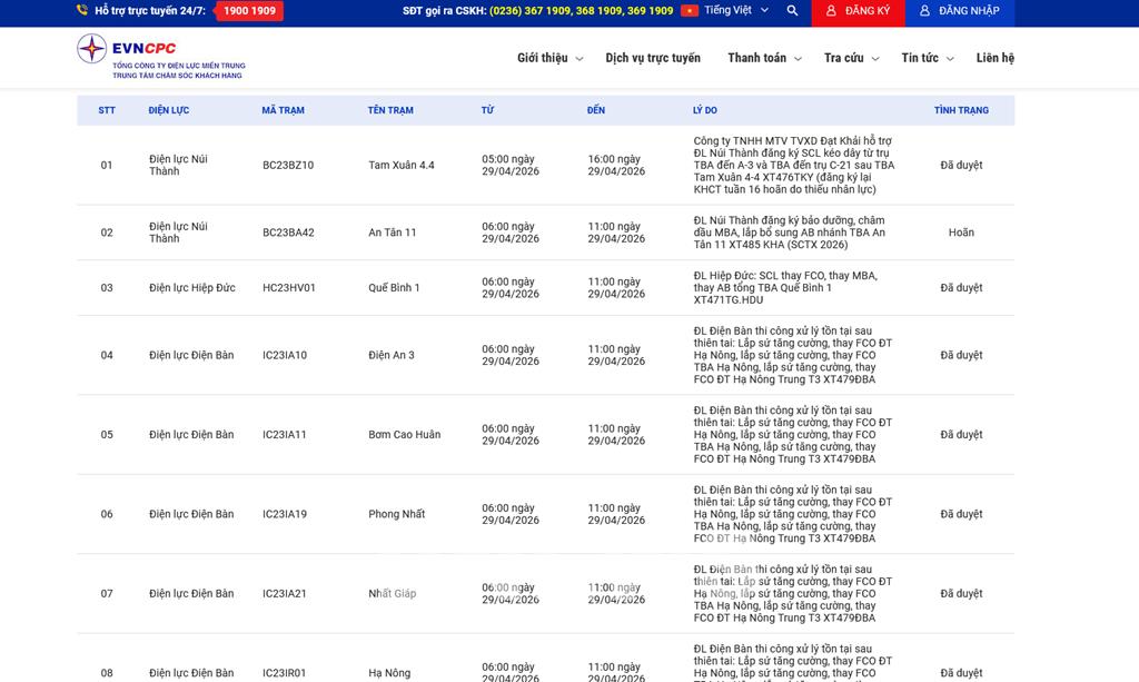 | 8 | Điện lực Điện Bàn | IC23IR01 | Hạ Nông | 06:00 29/04/2026 | 11:00 29/04/2026 | ĐL Điện Bàn thi công xử lý tồn tại sau thiên tai: Lắp sứ tăng cường, thay FCO ĐT Hạ Nông, lắp sứ tăng cường, thay FCO TBA Hạ Nông, lắp sứ tăng cường, thay FCO ĐT Hạ Nông Trung T3 XT479ĐBA | Đã duyệt |