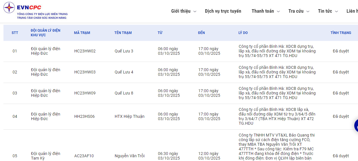 Đội quản lý điện Hiệp Đức | HC23HW03 | Quế Lưu 4 | 06:00 03/10/2025 | 17:00 03/10/2025 | Công ty cổ phần Bình Hà: XDCB dựng trụ, lắp xà, đấu nối đường dây XDM tại khoảng trụ 55/74-55/75 XT 471 TG.HDU | Đã duyệt |