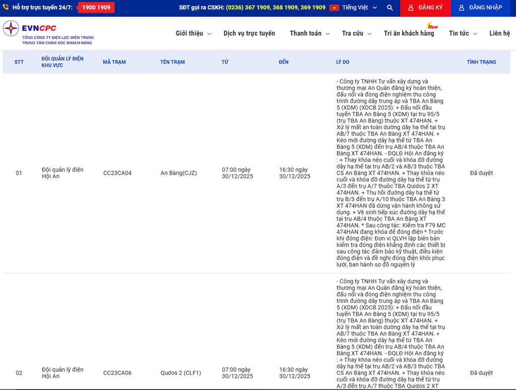 | 1 | Đội quản lý điện Hội An | CC23CA04 | An Bàng(CJZ) | 07:00 30/12/2025 | 16:30 30/12/2025 | - Công ty TNHH Tư vấn xây dựng và thương mại An Quân đăng ký hoàn thiện, đấu nối và đóng điện nghiệm thu công trình đường dây trung áp và TBA An Bàng 5 (XDM) (XDCB 2025):+ Đấu nối đầu tuyến TBA An Bàng 5 (XDM) tại trụ 95/5 (trụ TBA An Bàng) thuộc XT 474HAN.+ Xử lý mất an toàn dường dây hạ thế tại trụ AB/7 thuộc TBA An Bàng XT 474HAN.+ Kéo mới đường dây hạ thế từ TBA An Bàng 5 (XDM) đến trụ AB/4 thuộc TBA An Bàng XT 474HAN.- ĐQLĐ Hội An đăng ký :+ Thay khóa néo cuối và khóa đỡ đường dây hạ thế tại trụ AB/2 và AB/3 thuộc TBA CS An Bàng XT 474HAN.+ Thay khóa néo cuối và khóa đỡ đường dây hạ thế từ trụ A/3 đến trụ A/7 thuộc TBA Quidos 2 XT 474HAN.+ Thu hồi đường dây hạ thế từ trụ B/3 đến trụ A/10 thuộc TBA An Bàng 3 XT 474HAN đã dừng vận hànhkhông sử dụng.+ Vệ sinh tiếp xúc đường dây hạ thế tại trụ AB/4 thuộc TBA An Bàng XT 474HAN.* Sau công tác: Kiểm tra F79 MC 474HAN đang khóa để đóng điện* Trước khi đóng điện: Đơn vị QLVH lập biên bản kiểm tra đóng điện khẳng định các thiết bị sau công tác đảm bảo kỹ thuật, điều kiện đóng điện và đề nghị đóng điện khôi phục lưới, ban hành sơ đồ nguyên lý | Đã duyệt |