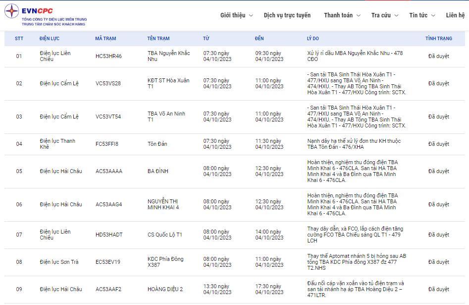 | Điện lực Liên Chiểu | HC53HR46 | TBA Nguyễn Khắc Nhu | 07:30 04/10/2023 | 09:30 04/10/2023 | Xử lý rỉ dầu MBA Nguyễn Khắc Nhu - 478 CĐO |