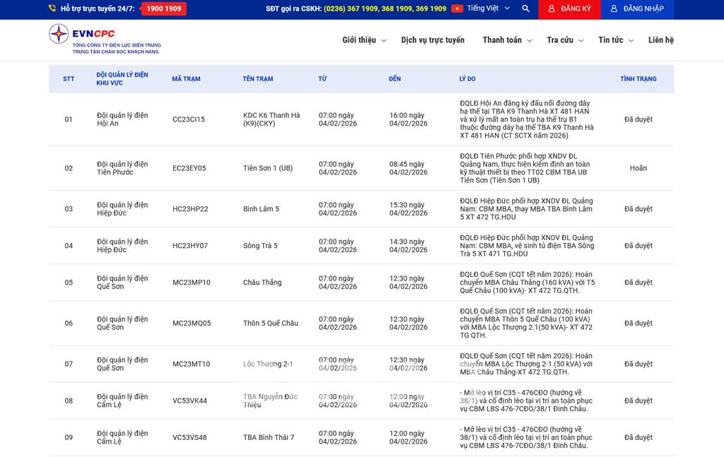 | 1 | Đội quản lý điện Hội An | CC23CI15 | KDC K6 Thanh Hà (K9)(CKY) | 07:00 04/02/2026 | 16:00 04/02/2026 | ĐQLĐ Hội An đăng ký đấu nối đường dây hạ thế tại TBA K9 Thanh Hà XT 481 HAN và xử lý mất an toàn trụ hạ thế trụ B1 thuộc đường dây hạ thế TBA K9 Thanh Hà XT 481 HAN (CT SCTX năm 2026) | Đã duyệt |