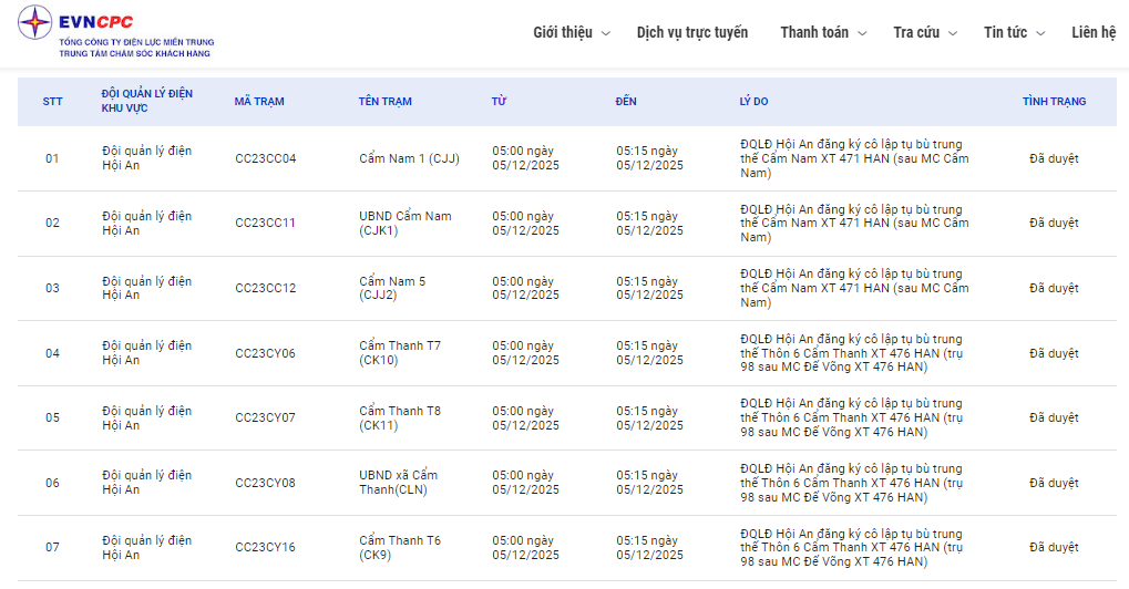 | Đội quản lý điện Hội An | CC23CC12 | Cẩm Nam 5 (CJJ2) | 05:00 05/12/2025 | 05:15 05/12/2025 | ĐQLĐ Hội An đăng ký cô lập tụ bù trung thế Cẩm Nam XT 471 HAN (sau MC Cẩm Nam) | Đã duyệt |