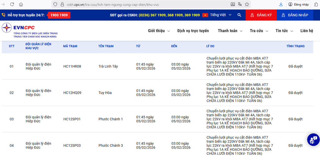 | Đội quản lý điện Hiệp Đức | HC12SY09 | Thôn 4A Phước Thành | 01:45 05/02/2026 | 03:00 05/02/2026 | Chuyển lưới phục vụ cắt điện MBA AT7 trạm biến áp 220kV Đăk Mi 4A, tách cáp lực 22kV ra khỏi MBA AT7(Kết hợp mục 7 Phụ lục 1A KẾ HOẠCH BẢO DƯỠNG, SỬA CHỮA LƯỚI ĐIỆN 110kV- TUẦN 06) | Đã duyệt |