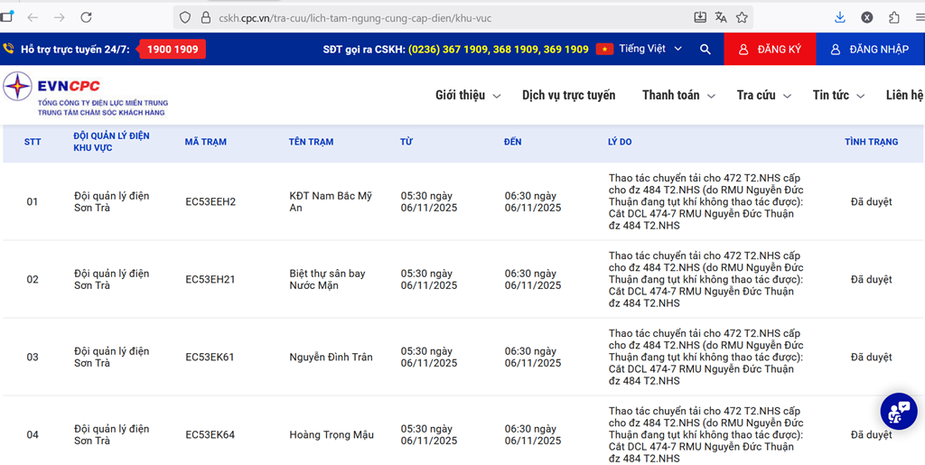 | 21 | Đội quản lý điện Núi Thành | BH23BT38 | Cục Hậu Cần Quân Khu 5 | 06:00 06/11/2025 | 12:00 06/11/2025 | ĐQLĐ Núi Thành đăng ký SCTX thay khóa dây, chuổi sứ polime, móc U, tiếp xúc lèo tại trụ 190 đến trụ 191/5, trụ 193/1 đến trụ 193/6 XT 485 KHA; Thu hồi TU tại trụ 196 XT 485 KHA; Bảo dưỡng MBA TBA Cảng Kỳ Hà tại trụ 191/1/4- 191/1/5 XT 485 KHA (SCTX 2025) | Đã duyệt |