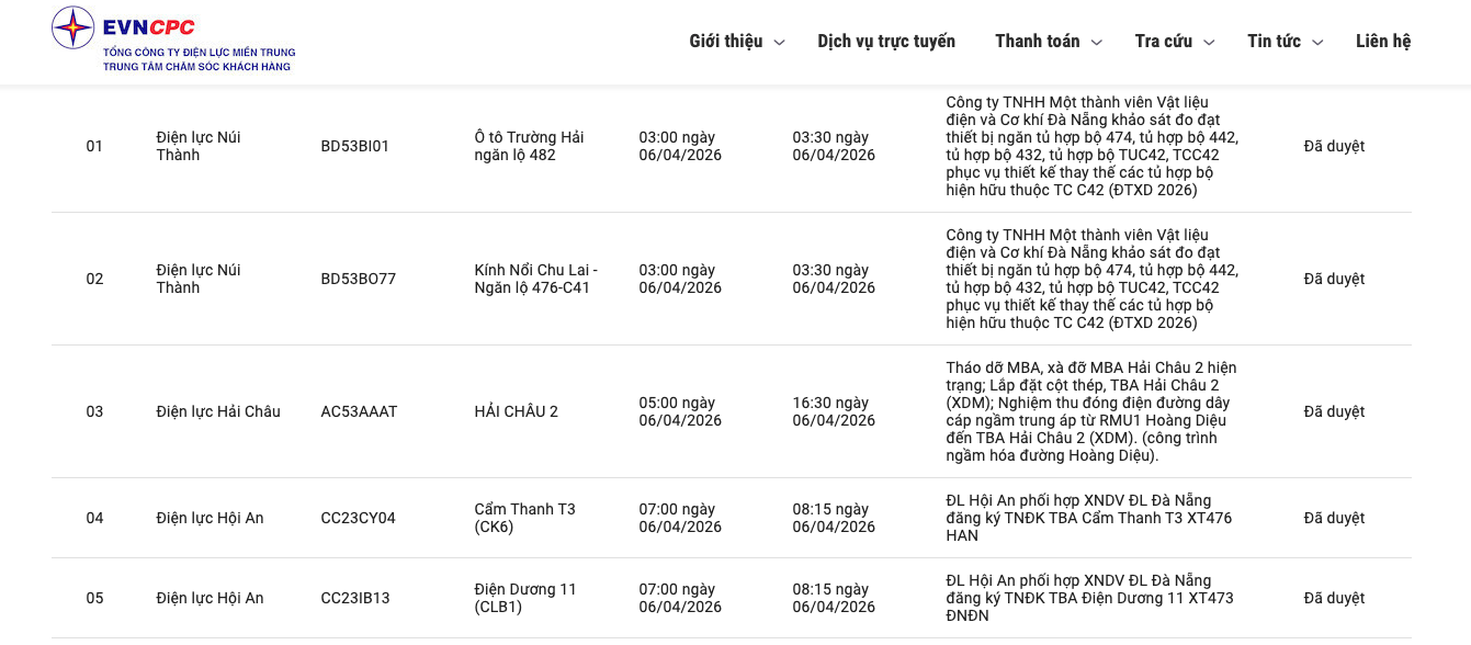| Điện lực Hải Châu | AC53AAAT | HẢI CHÂU 2 | 05:00 06/04/2026 | 16:30 06/04/2026 | Tháo dỡ MBA, xà đỡ MBA Hải Châu 2 hiện trạng;Lắp đặt cột thép, TBA Hải Châu 2 (XDM);Nghiệm thu đóng điện đường dây cáp ngầm trung áp từ RMU1 Hoàng Diệu đến TBA Hải Châu 2 (XDM).(công trình ngầm hóa đường Hoàng Diệu). | Đã duyệt |