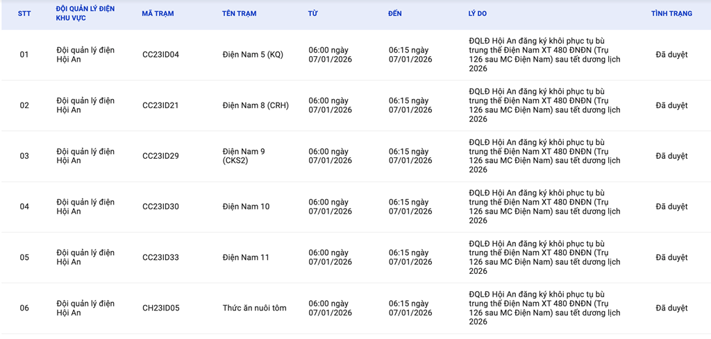 | 6 | Đội quản lý điện Hội An | CH23ID05 | Thức ăn nuôi tôm | 06:00 07/01/2026 | 06:15 07/01/2026 | ĐQLĐ Hội An đăng ký khôi phục tụ bù trung thế Điện Nam XT 480 ĐNĐN (Trụ 126 sau MC Điện Nam) sau tết dương lịch 2026 | Đã duyệt |