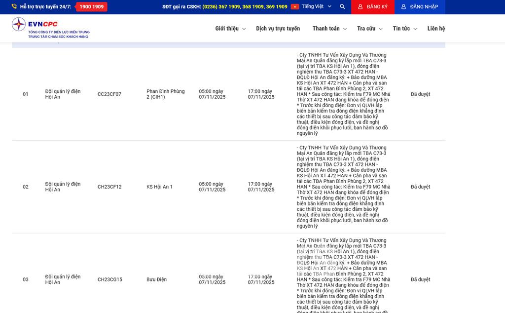 | 3 | Đội quản lý điện Hội An | CH23CG15 | Bưu Điện | 05:00 07/11/2025 | 17:00 07/11/2025 | - Cty TNHH Tư Vấn Xây Dựng Và Thương Mại An Quân đăng ký lắp mới TBA C73-3 (tại vị trí TBA KS Hội An 1), đóng điện nghiệm thu TBA C73-3 XT 472 HAN- ĐQLĐ Hội An đăng ký:+ Bảo dưỡng MBA KS Hội An XT 472 HAN+ Cân pha và san tải các TBA Phan Đình Phùng 2, XT 472 HAN * Sau công tác: Kiểm tra F79 MC Nhà Thờ XT 472 HAN đang khóa để đóng điện* Trước khi đóng điện: Đơn vị QLVH lập biên bản kiểm tra đóng điện khẳng định các thiết bị sau công tác đảm bảo kỹ thuật, điều kiện đóng điện, và đề nghị đóng điện khôi phục lưới, ban hành sơ đồ nguyên lý | Đã duyệt |