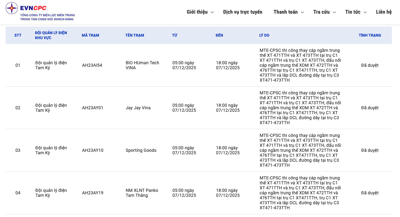| Đội quản lý điện Tam Kỳ | AH23AY25 | Panko Tam Thăng (T6) | 05:00 07/12/2025 | 18:00 07/12/2025 | MTE-CPSC thi công thay cáp ngầm trung thế XT 471TTH và XT 473TTH tại trụ C1 XT 471TTH và trụ C1 XT 473TTH, đấu nối cáp ngầm trung thế XDM XT 472TTH và 476TTH tại trụ C1 XT471TTH, trụ C1 XT 473TTH và lắp DCL đường dây tại trụ C3 XT471-473TTH | Đã duyệt |